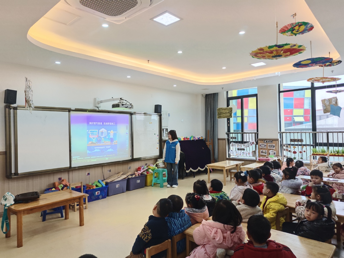 志愿者们利用为学龄前儿童精心准备的卡通动画PPT展开讲解。内容将管道安全、生活中的逃生避难自救安全知识相结合,通过简洁明了的图片和鲜活的动画,向孩子们介绍了日常生活中可能遇到的相关安全常识。志愿者用贴近孩子生活、便于孩子理解的语言,说明了远离管道井盖、识别安全标识、遵守交通规则的重要性。“大家猜猜,妈妈做饭的天然气,是从哪儿跑到我们家灶台的呢?”活动一开始,志愿者的问题就把孩子们的好奇心勾了起来。随着一段关于“西气东输”的趣味视频播放,一条蜿蜒千里的能源动脉仿佛在孩子们眼前展开。原来,那些埋在地下的管道,就像一条条看不见的公路,日夜不停地为我们输送着能量。